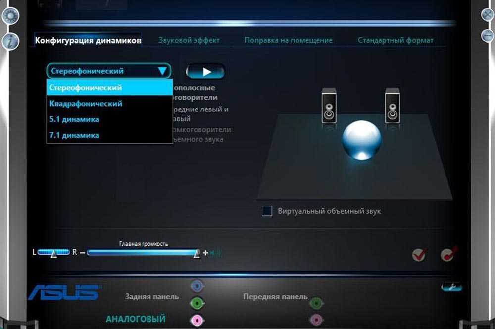 - Конфигурация – здесь можно задать моно или стерео режим, проверить работоспособность колонок, активировать объемный виртуальный звук;