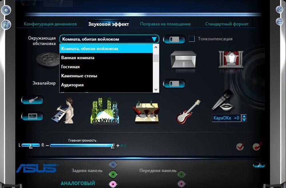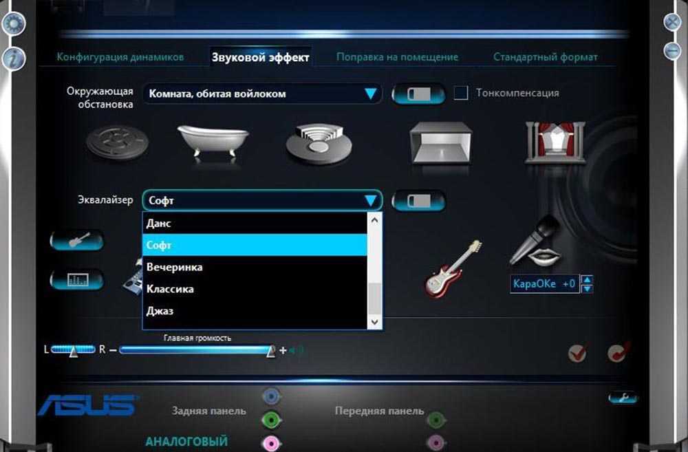 Во вкладке «Звуковой эффект» для пользователя главными являются 2 параметра: эквалайзер и тип окружающей обстановки, где диспетчер предлагает множество вариантов настройки. Рекомендуется выбрать в качестве окружающей обстановки «Комнату, обитую войлоком» – в этом случае звук будет более приятным. Режим эквалайзера стоит менять в зависимости от того, какое устройство используется для воспроизведения аудио. Для акустической системы более подходит «Мощный», для двух динамиков или наушников – «Софт».
