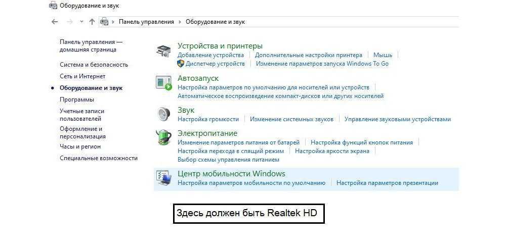После перезагрузки ПК повторно зайти в «Панель управления» и проверить, отобразился ли в разделе «Оборудование и звук» новый элемент Realtek HD.