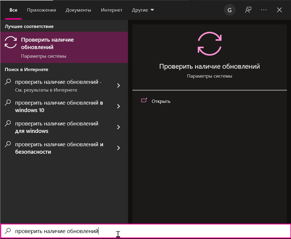 1) В поле поиска введите «Проверить наличие обновлений». Нажмите кнопку «Проверить наличие обновлений» в результатах.