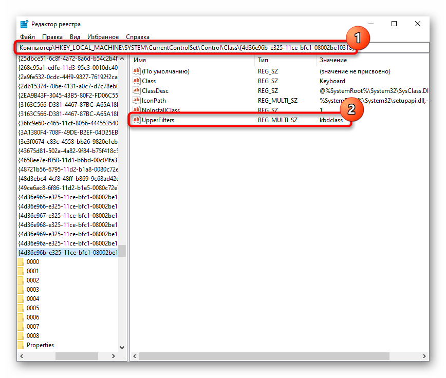 - Откройте «Редактор реестра», как было показано ранее, перейдите по пути HKEY_LOCAL_MACHINE\SYSTEM\CurrentControlSet\Control\Class\ . Найдите там параметр «UpperFilters». Он должен иметь значение «kbdclass».