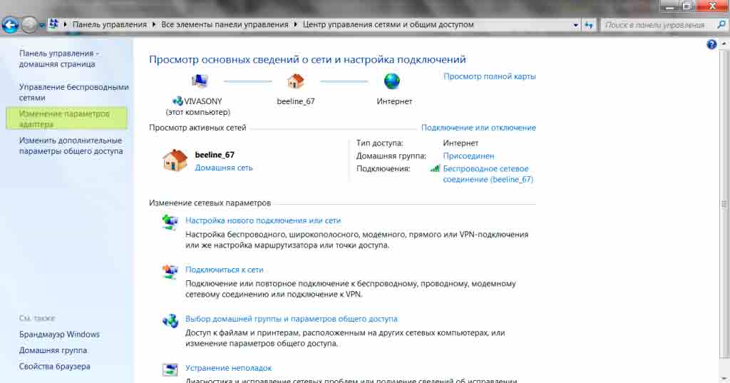 В «Центре управления сетями и общим доступом» перейдите на «Изменение параметров адаптера».
