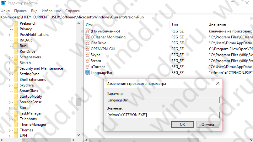 - Введите в поле «Значение» строку ”ctfmon”=”CTFMON.EXE” (с применением кавычек);