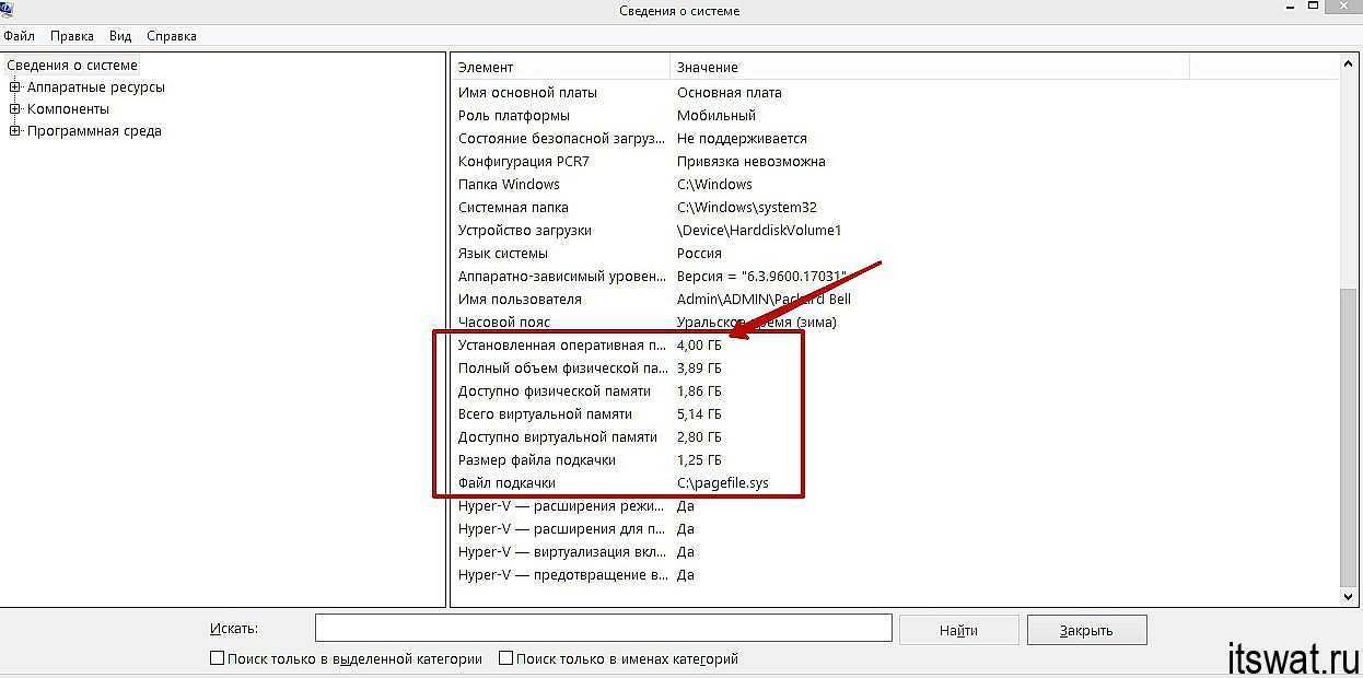 - прокручиваем список и ищем раздел «Установленная оперативная память».