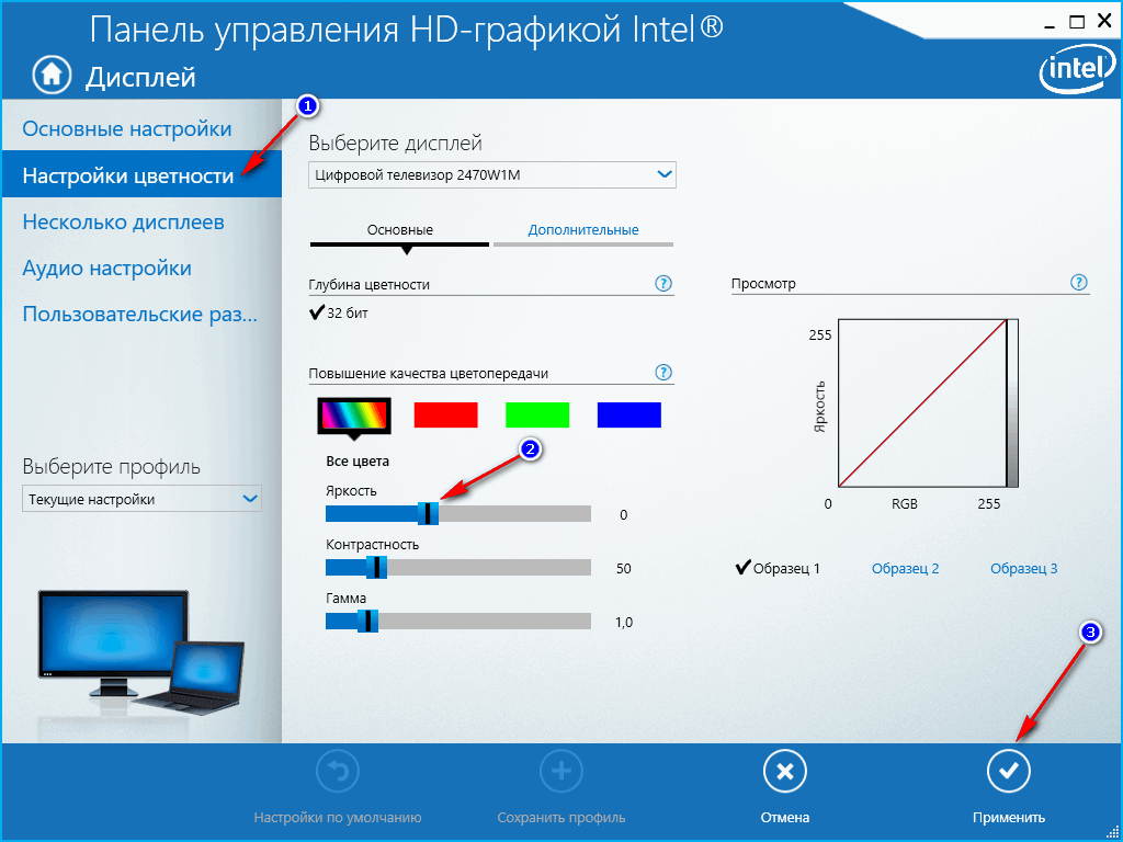 В появившемся окне находим пункт цвет и выставляем нужный уровень яркости.