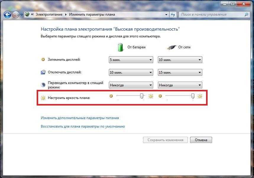 Также вы можете зайти в настройки плана электропитания и выставить яркость, при которой портативный компьютер будет работать от батареи или от сети.