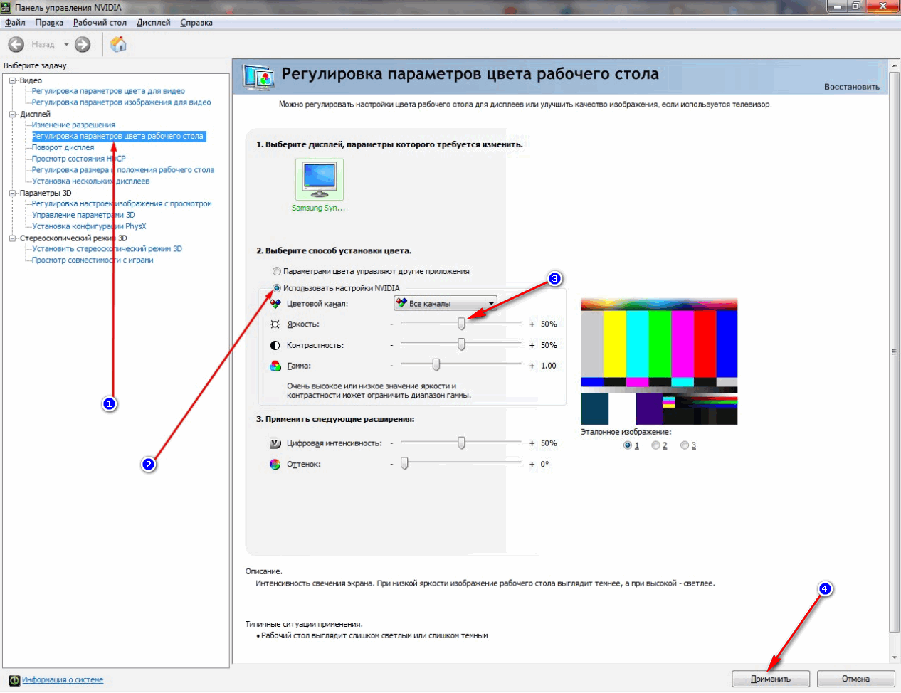 Кликаем по этому разделу и ожидаем пока откроется окно драйверов. Оно будет грузиться немного дольше, но в нем и возможностей больше. Далее, слева в меню находим пункт под названием «Регулировка параметров цвета для видео» и жмем по нему. Справа откроется список, где во втором пункте ставим регулятор на строку «С настройками NVIDIA» и во вкладке «Цвет» регулируем насыщенность. После окончания процедуры нажимаем «применить».