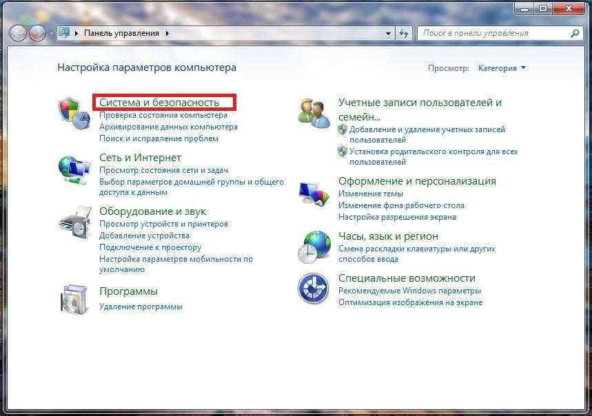 После запуска Панели управления необходимо перейти в раздел «Система и безопасность».