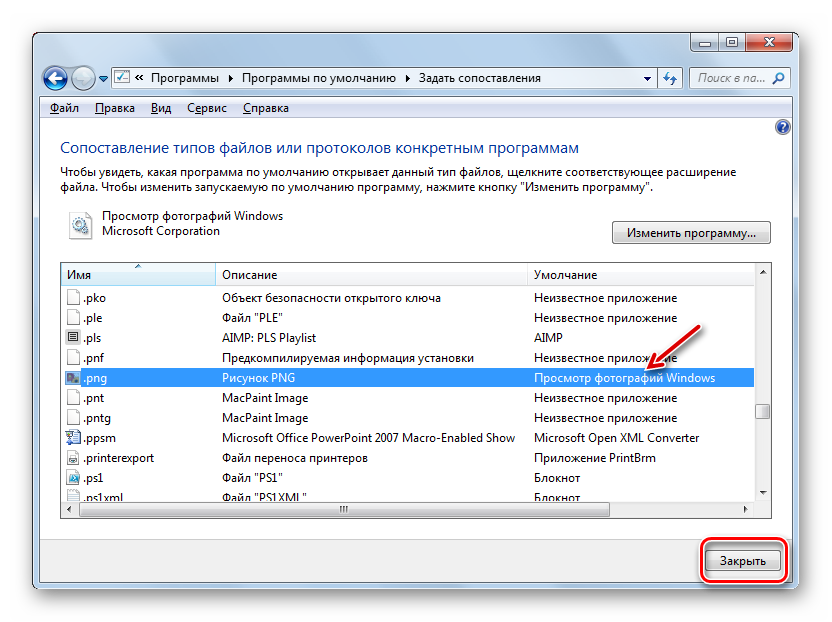 После этого сопоставление поменяется. Теперь данный тип картинок будет открываться по умолчанию с помощью просмотрщика фотографий Windows. Аналогичным образом поменяйте ассоциации всех тех типов изображений, которые желаете открывать через стандартное средство. После выполнения необходимых действий можете выходить из окна управления сопоставлениями, нажав «Закрыть».