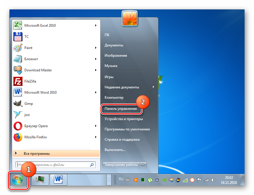 - Кликните кнопку «Пуск» в нижнем левом углу экрана и выберите «Панель управления».