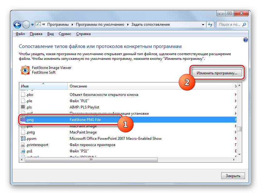 Загрузится список всех типов файлов, зарегистрированных в системе. Отыщите в нем наименование расширения того типа картинок, который хотите открывать при помощи средства просмотра, выделите его и нажмите «Изменить программу…».
