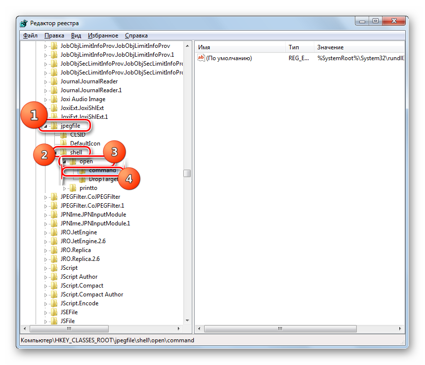 Наконец, следует выполнить процедуру указания сопоставления для картинок с расширением JPEG. Перейдите в директории «HKEY_CLASSES_ROOT» по разделам: