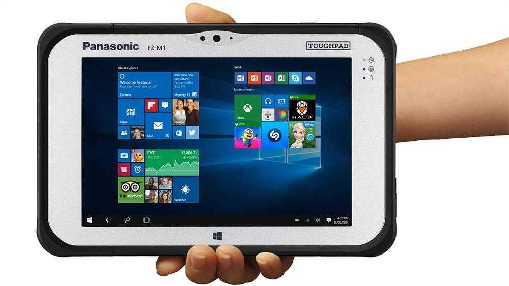 Защищённый планшет Panasonic Toughpad FZ-M1 – это планшет, ориентированный на пользователей, которые работают на улице и рассчитывают на надёжный и стабильный помощник. Он весит 450 г. и имеет размеры 203x18x132 мм. По умолчанию ОС – Windows 10 Pro, а размер экрана – 7 дюймов при разрешении 1280×800 пикселей. Процессор – Intel Core m5-6Y57 vPro с 4 гигабайтами RAM. Для хранения файлов – 128 гигабайт, но устройство имеет слот microSD, с помощью которого вы можете расширить память, если вам нужно больше места. В дополнение к этому, устройство также имеет аккумулятор ёмкостью 3220 мАч, что не совсем впечатляет, учитывая, что для наружного использования дисплей будет работать на более высокой яркости и с учётом цены устройства.