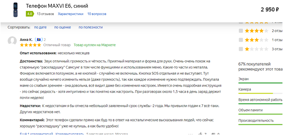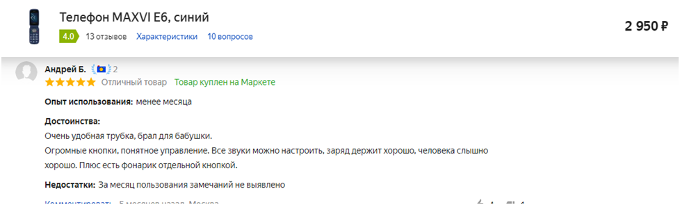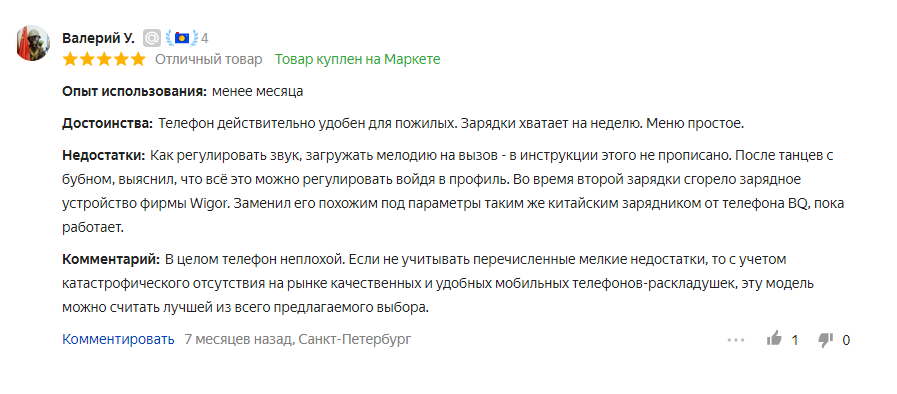 «Несмотря на немалое количество минусов, в целом телефон неплохой. Особенно понравился в нём фонарик. Он хорошо освещает дорогу и любой тёмный переулок. Ещё один важный, по моему мнению, плюс – громкий динамик».