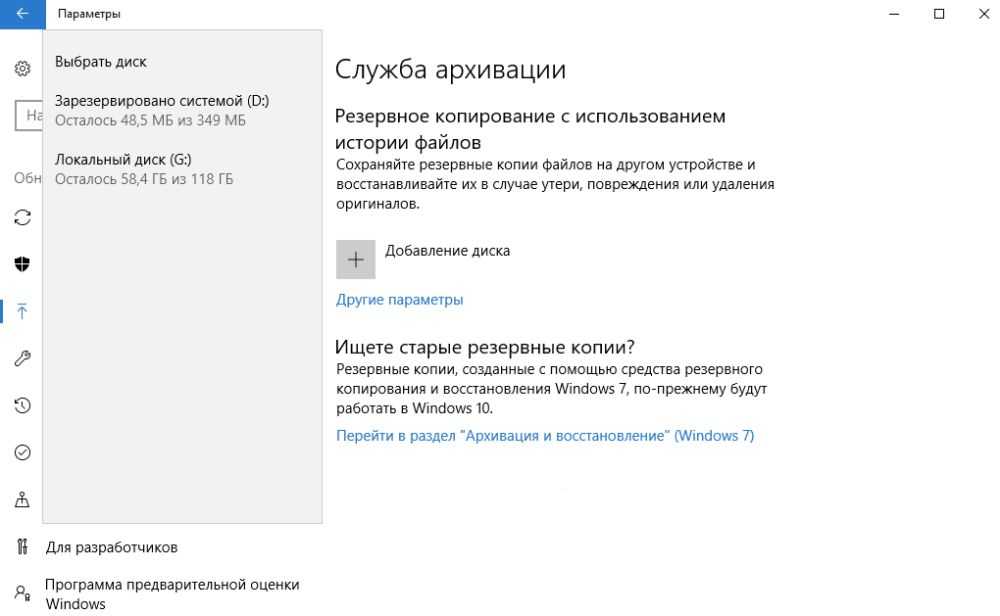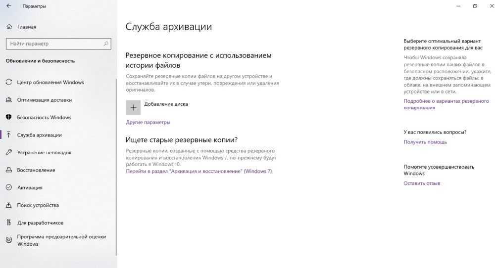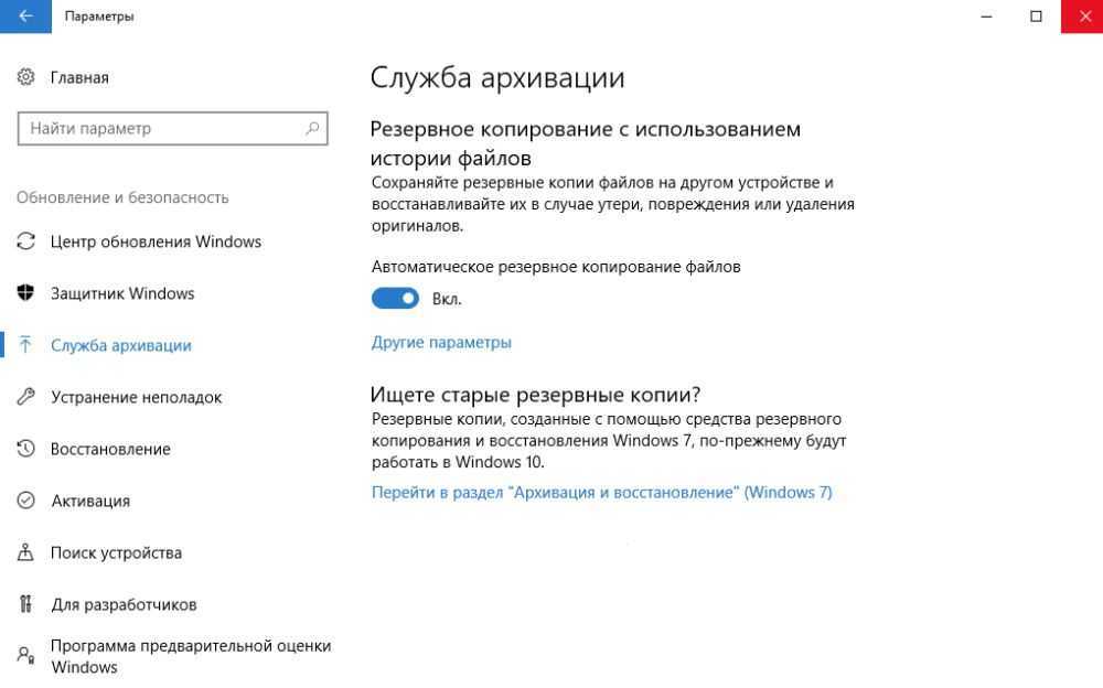 Зайти в «Параметры» путем нажатия на кнопки Win+I, далее – «Обновление и безопасность». В меню слева перейти в «Службу архивации».