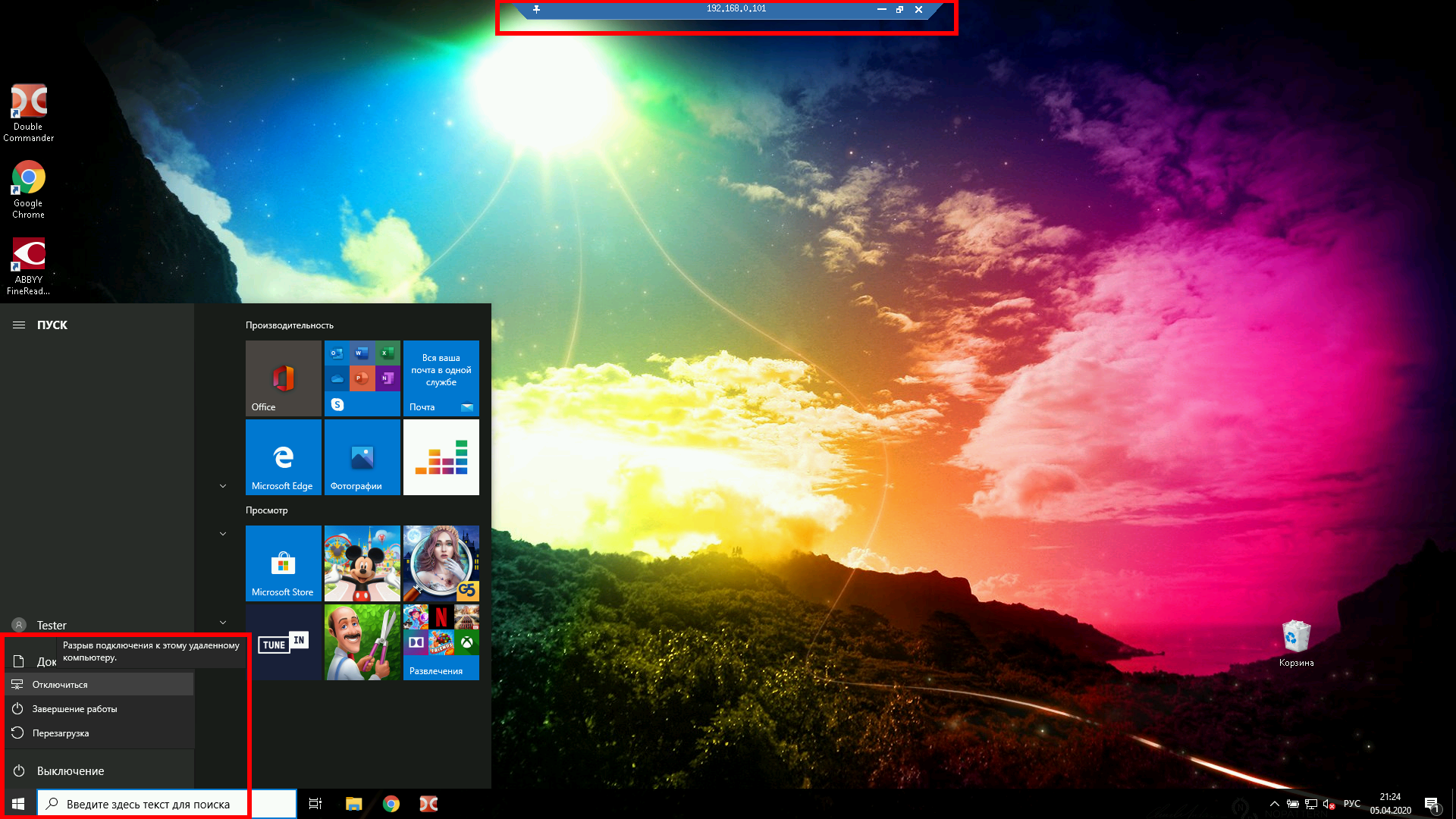 В полноэкранном режиме вы можете отключиться от удалённого рабочего стола двумя способами:
