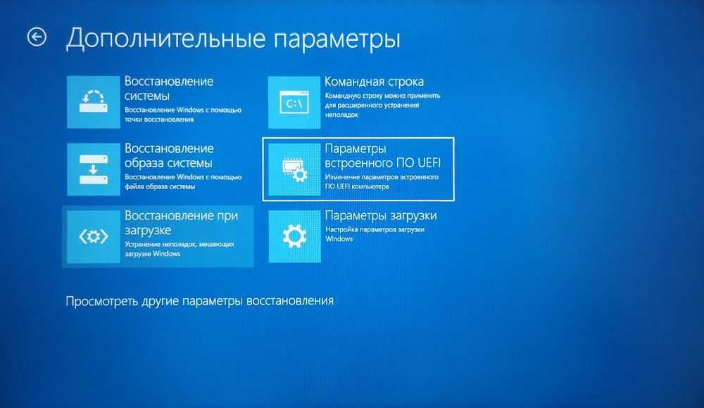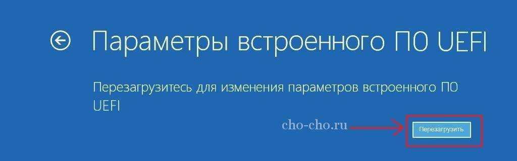 Нужно перейти в раздел «Диагностика» (или «Поиск и устранение неполадок»), далее – в «Дополнительные параметры» – «Параметры встроенного ПО UEFI» и подтвердить необходимость перезагрузки нажатием клавиши.