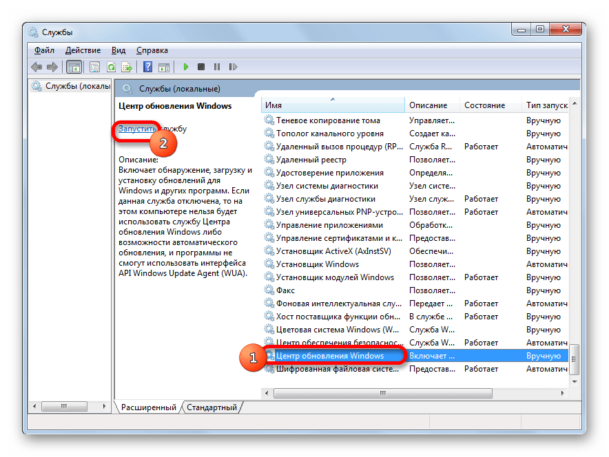 5. Снова заходим в “Службы”, находим службу “Центр обновления Windows“ и щелкаем по ней два раза левой кнопкой мыши (ЛКМ). В открывшемся окне нажимаем кнопку “Запустить” и дожидаемся запуска службы.
