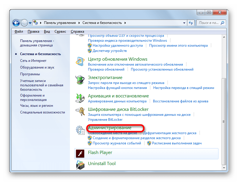 - Для того, чтобы перейти в Диспетчер служб, перемещаемся в уже знакомый нам раздел Панели управления «Система и безопасность». Там кликаем по варианту «Администрирование».