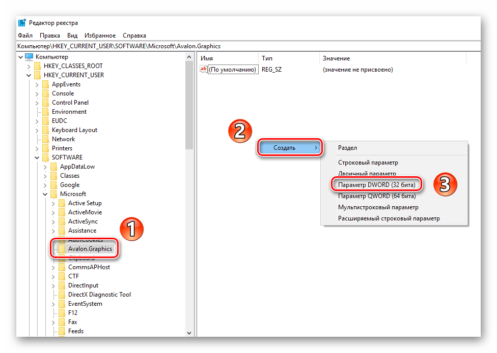 - Переходим в следующее расположение реестра HKEY_CURRENT_USERSoftwareMicrosoftAvalon.Graphics.
