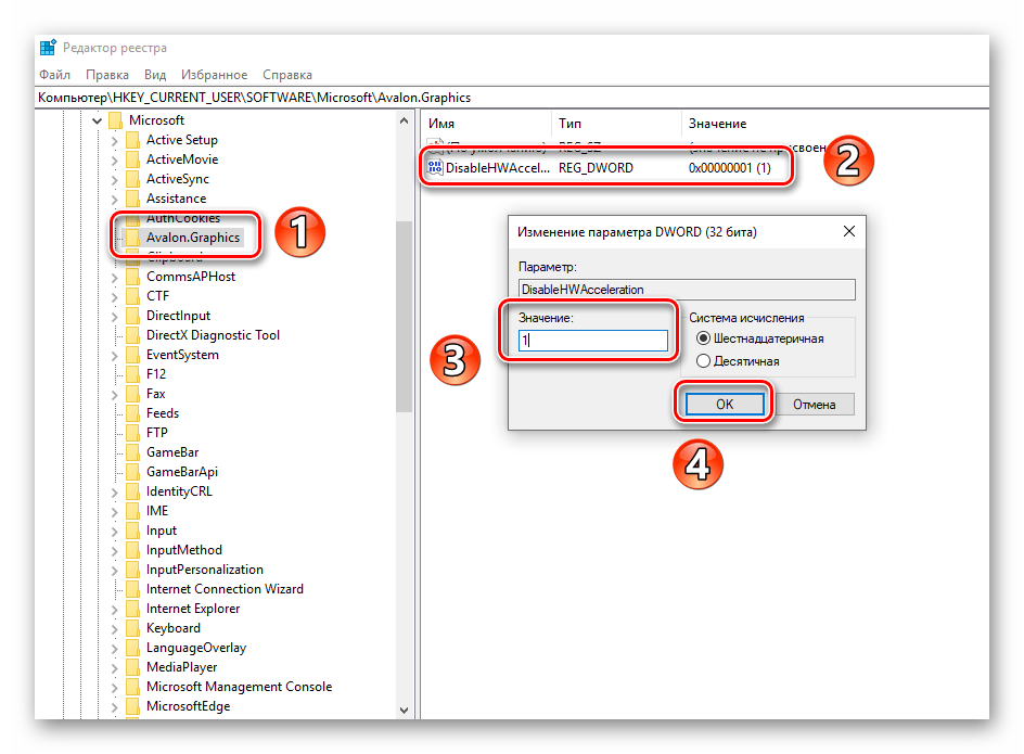 - Переходим в следующее расположение реестра HKEY_CURRENT_USER\Software\Microsoft\Avalon.Graphics.