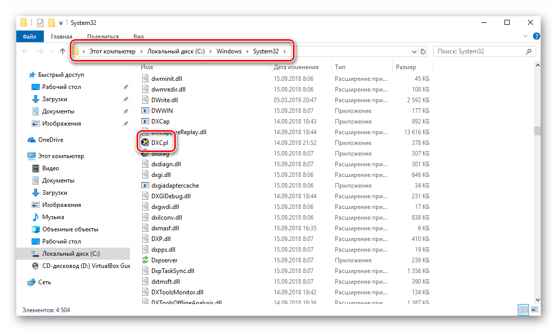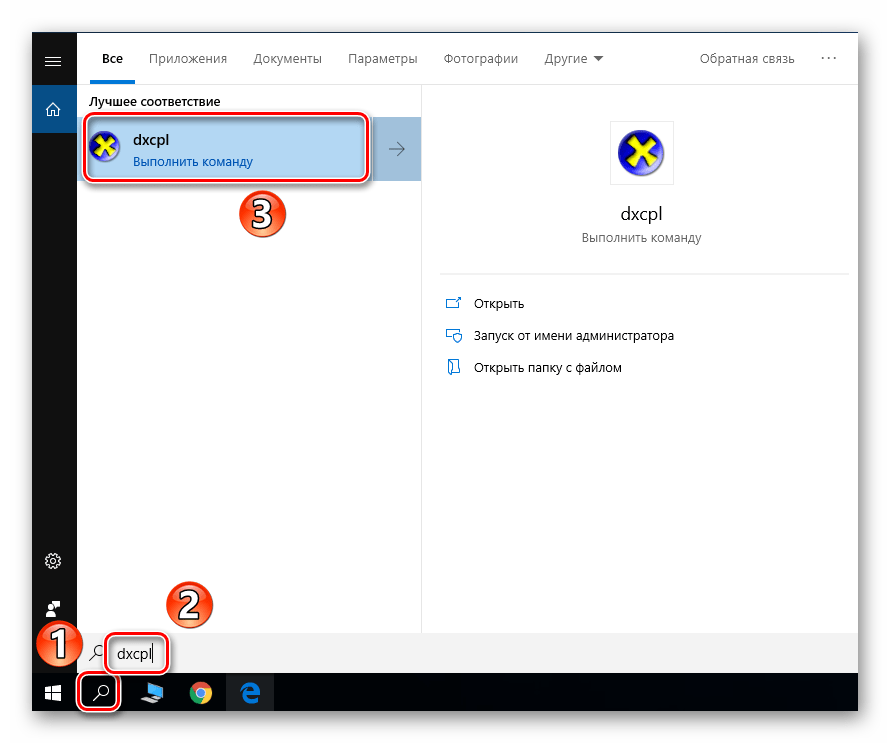 Также можно открыть окно поиска на «Панели задач» в Windows 10, ввести фразу «dxcpl» и кликнуть по найденному приложению ЛКМ.