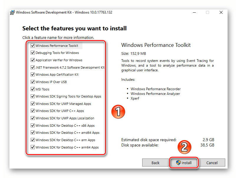 После этого вы увидите перечень компонентов, которые будут инсталлированы в составе пакета SDK. Мы рекомендуем ничего не изменять, а просто нажать «Install» для начала установки.
