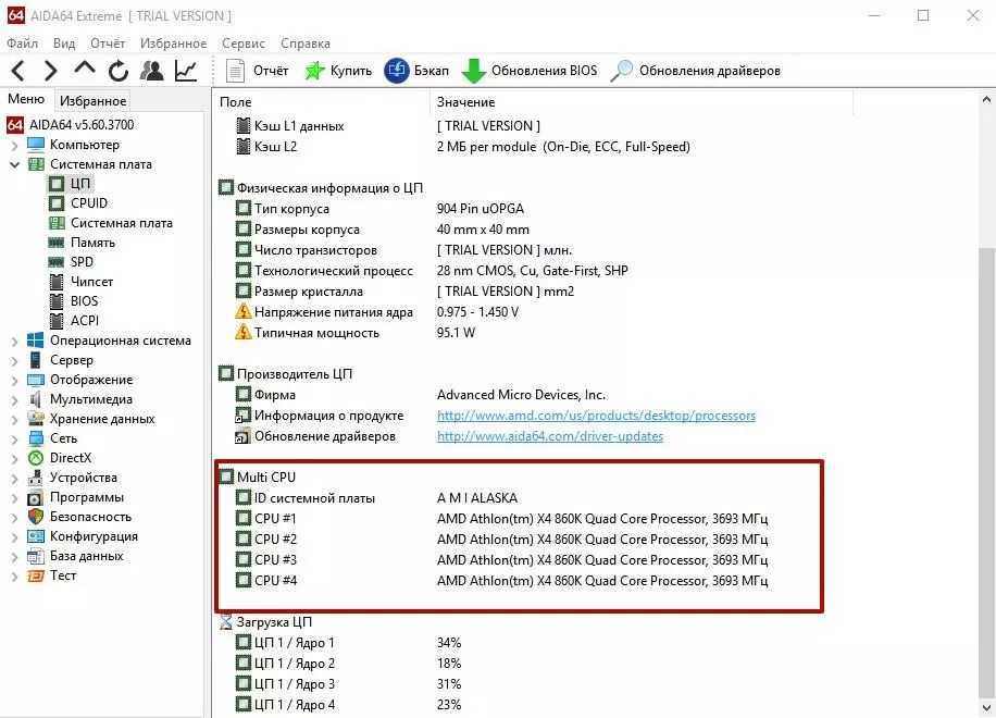 У AIDA64 также имеется бесплатная версия программы, которой вы можете воспользоваться. Открыв её, перейдите к пункту «Системная плата» — «ЦП». Отыщите блок Multi CPU и посчитайте, сколько ядер в нём описано.