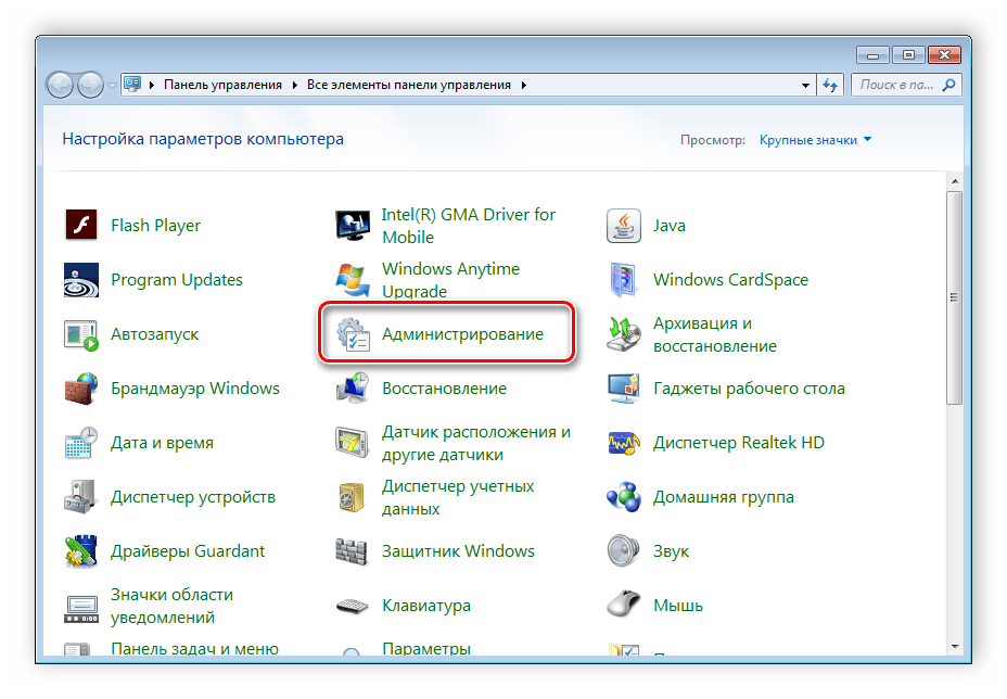 - Доступ к списку служб осуществляется из «Панели управления», где нужно найти категорию «Администрирование».