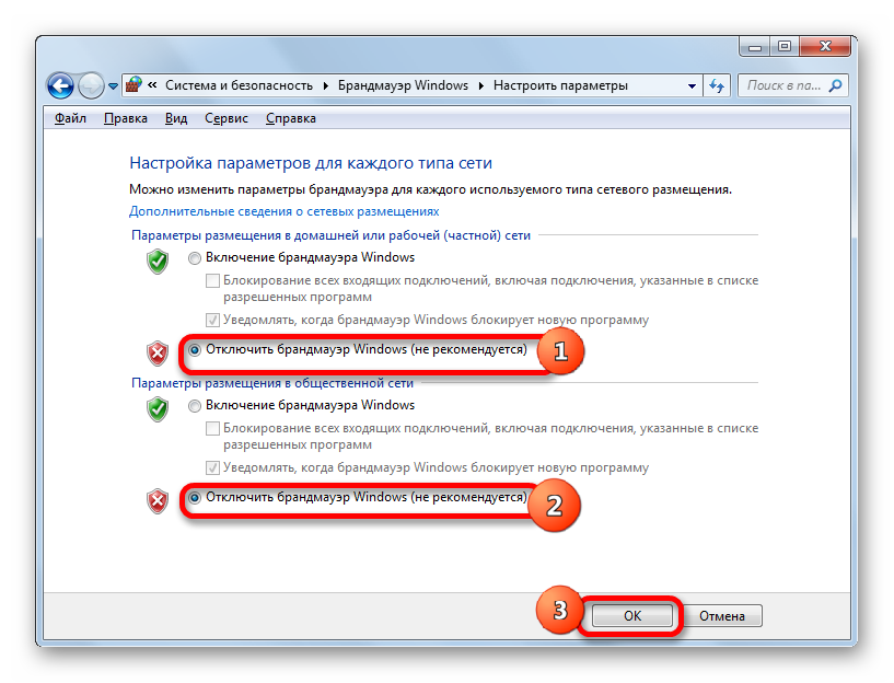 Защитник Виндовс может не пропускать некоторые пакеты, например, при попытке распечатать документ, и вы получите ошибку о недоступном RPC-сервисе. В таком случае брандмауэр потребуется временно или навсегда отключить. Сделать это можно любым удобным для вас способом. Более подробно об отключении данной функции читайте в нашей отдельной статье.