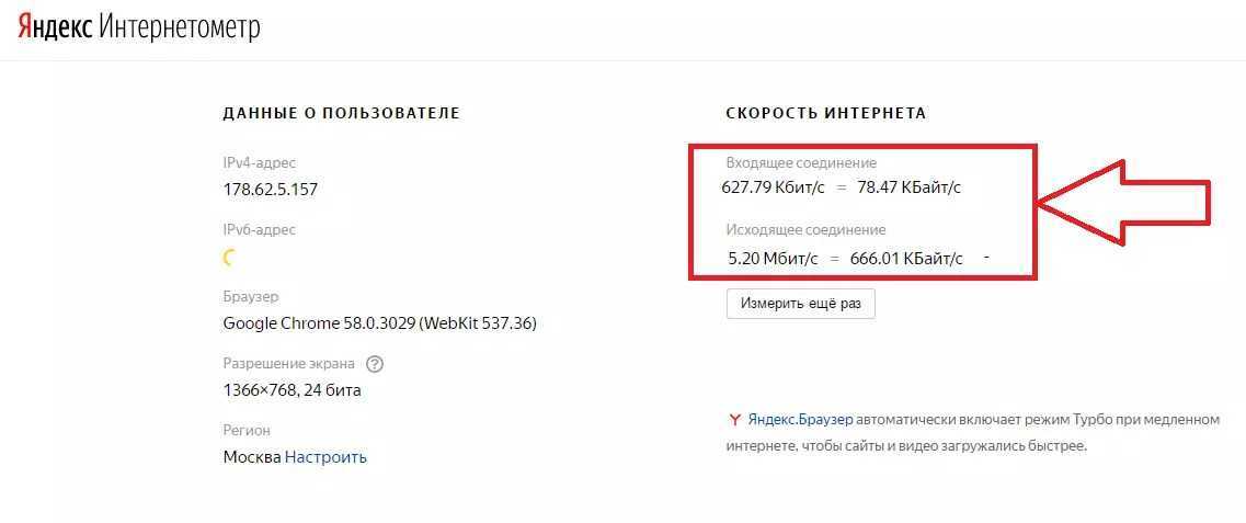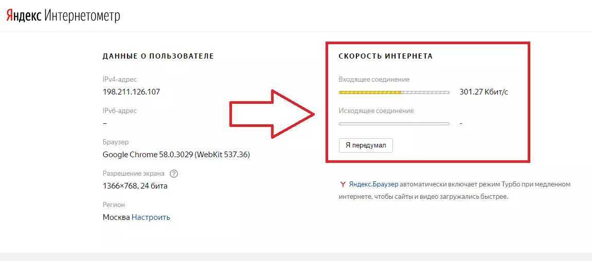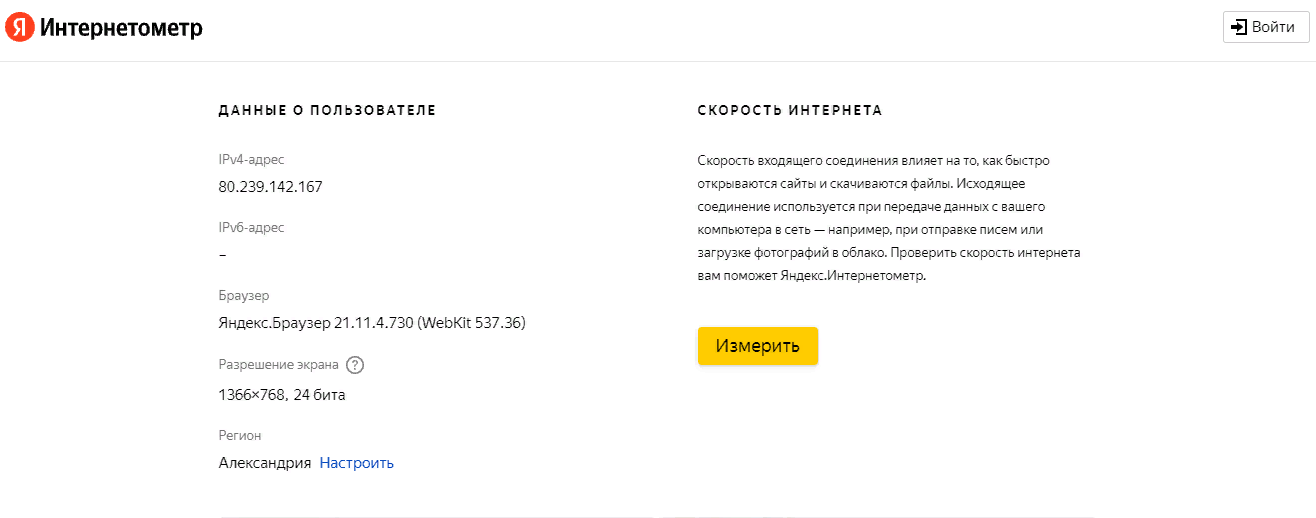 Известнейшая компания Яндекс также имеет свой ресурс, позволяющий узнать скорость интернета. Как только вы заходите на нужную страницу Интернетометра, вы сразу видите данные о своем расположении, IP-адресе, разрешении дисплея оборудования, точности времени и используемом браузере.