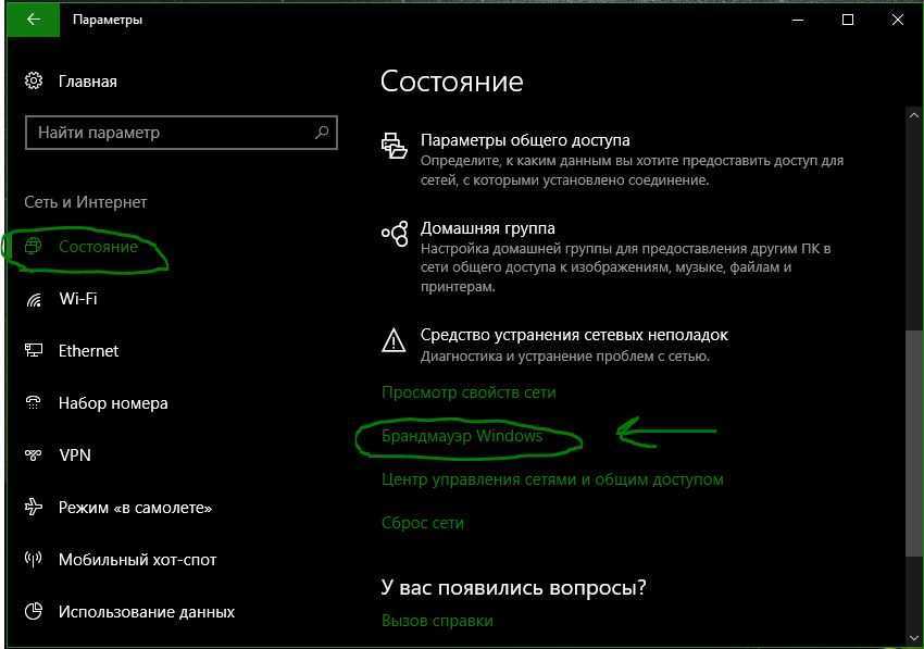 Первое, что нужно сделать, это открыть страницу Все параметры Windows 10 и перейти на пункт Сеть и Интернет. В следующем окне, выбираем параметр Состояния, который отображается в меню слева, а затем ищем параметр Брандмауэр Windows в панели справа.