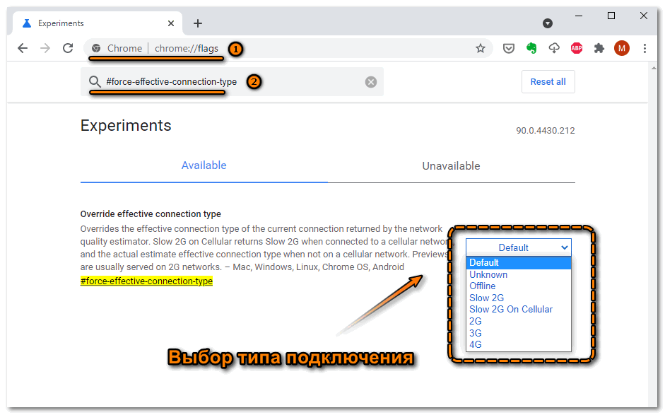 После перехода в раздел в поисковике пропишите запрос #force-effective-connection-type. После нажатия на клавишу ввода появится один параметр. Чтобы изменить его, кликните на кнопку слева для вызова раскрывающегося меню. В нем отобразятся различные типы подключения, выберите подходящий. После этого Хром автоматически подберет конфигурация расхода трафика.