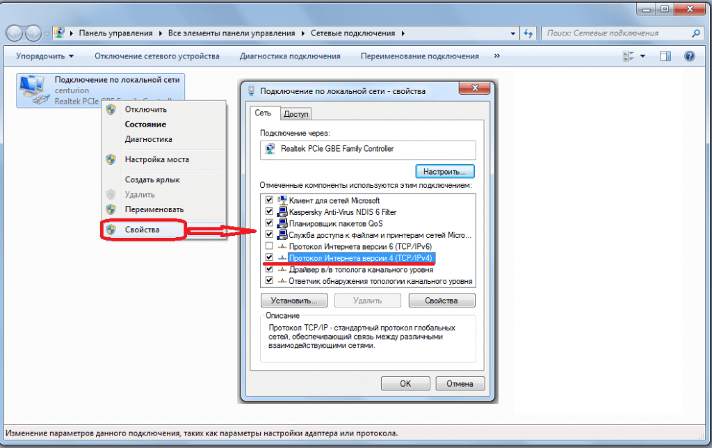 Следующий этап — непосредственно настройка свойств подключения. Для этого в появившемся окне состояния сетевого соединения надо нажать кнопку «Свойства». Далее дважды кликаем мышкой на пункт «Протокол интернета версии 4 (TCP/IPv4)». В принципе, в последнее время звучит все больше голосов, ратующих за отказ от этого уже, что греха таить, устаревающего стандарта, и постепенный переход на новую версию сетевого протокола — TCP/IPv6. К сожалению, пока большая часть провайдеров, в особенности небольших, не поддерживают его, и пользователям по старинке раздаются уже привычные 32-битные IP-адреса. Теперь пригодится тот листок с цифрами, который вам в свое время выдал представитель провайдера. Если используется статическая адресация, то следует в точности перенести цифры IP-адреса, маски подсети, шлюза и DNS-серверов в появившуюся форму. При этом учтите, что в такой распечатке ваш адрес и маска подсети могут указываться через дробь (например, 127.0.0.1/255.255.255.0), а основной шлюз может называться Gateway. Если провайдер использует динамическую адресацию и/или динамические DNS — тем лучше, выбираем соответствующий пункт диалога настройки IP-протокола, а потому это поле не заполняем. В общем-то, настройка интернета на этом может считаться законченной. Сохраните сделанные изменения, нажав кнопки «ОК». Если все было сделано правильно, и физически подключение присутствует, то в самом верху окна «Центра управления сетями и общим доступом» значок интернета (земной шар) станет цветным, а красный крестик между ним и схематическим изображением вашего компьютера исчезнет.