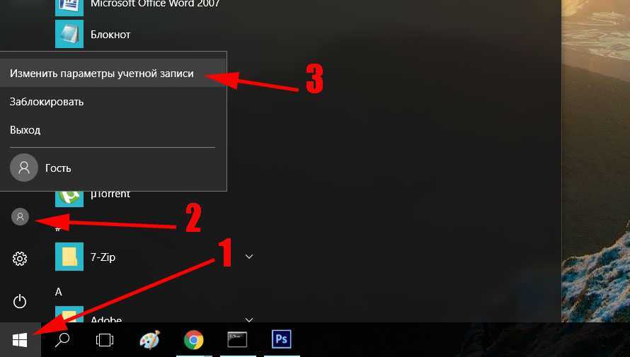 Жмем «Пуск», «Значок вашей учетной записи», «Изменить параметры учетной записи».