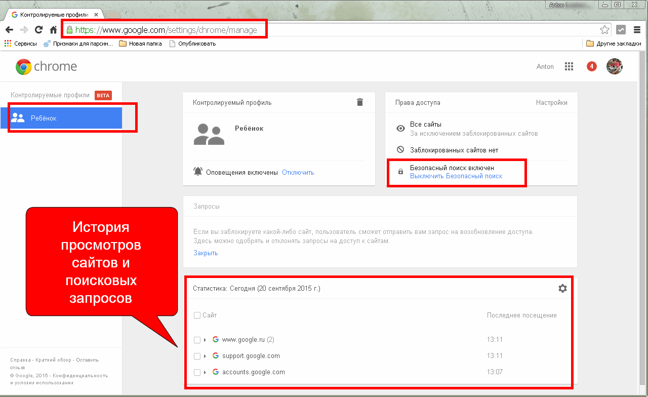 Функция родительский контроль встроена в браузер Google Chrome. Для ее активации следует войти в свой аккаунт, найти раздел «Пользователи» и выбрать пункт «Добавить нового пользователя». После того как открылось окно «Создание аккаунта пользователя», нужно выбрать фотографию, имя и активировать «Контролируемый профиль» нажатием клавиши «Создать».