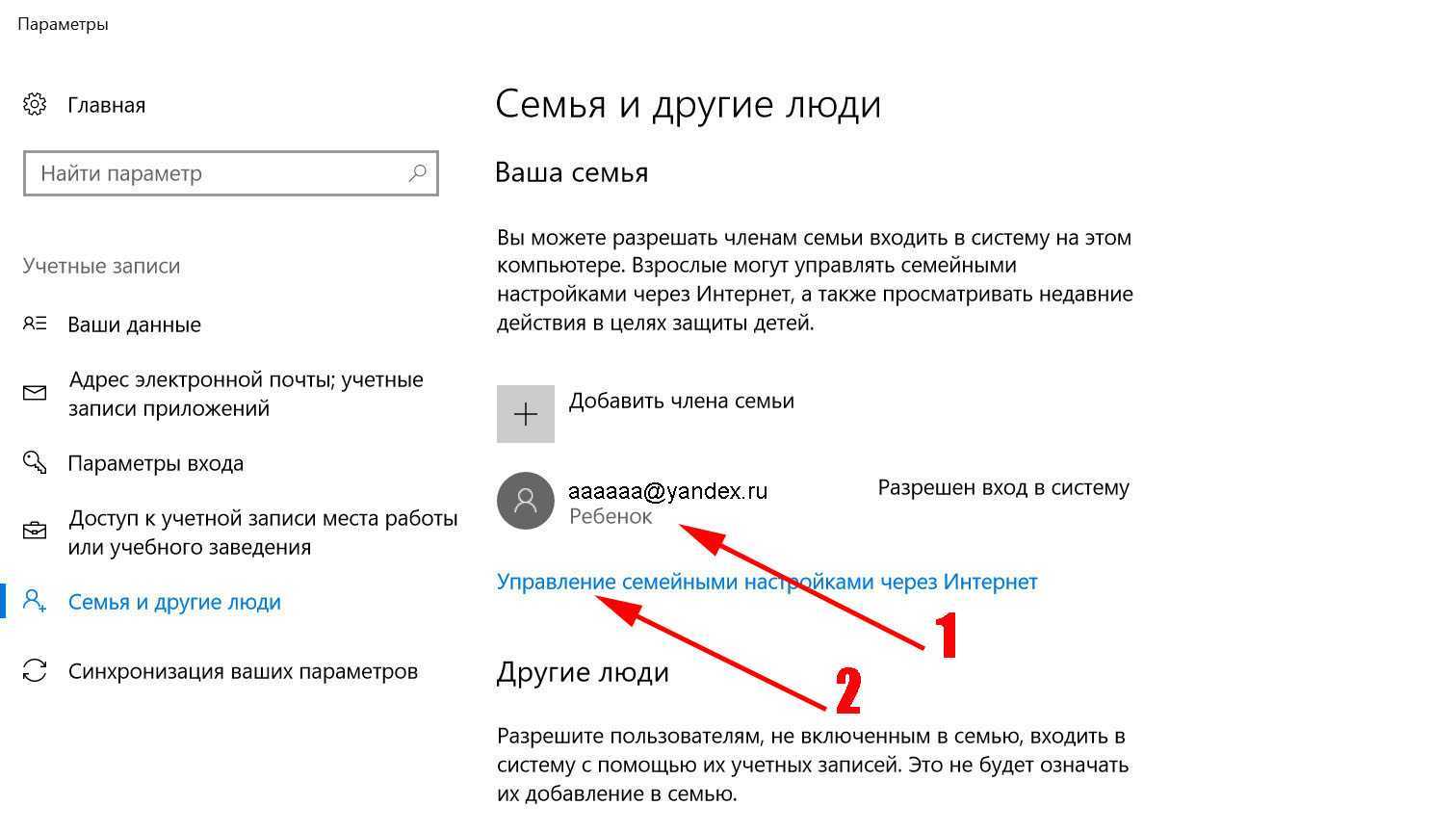 Зайдя повторно в раздел «Семья и другие люди» вы увидите созданную запись. Немного ниже нажмите на строку «Управление семейными настройками….», перейдя в этот раздел, вы сможете начать вносить нужные настройки.