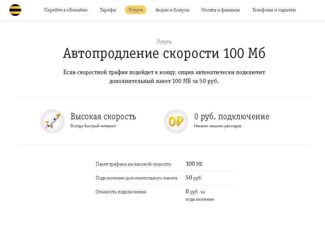 - Версия автопродления на 100 Мб по доступна на тарифах Билайн «Ноль сомнений», «Добро пожаловать», «Всешечка», «Все 1» и «Все 2». Стоимость каждого дополнительного пакета составляет 50 рублей каждый.