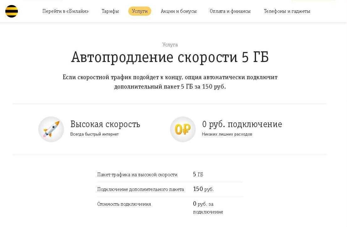 Если вам важно оставаться всегда онлайн, и вы не хотите следить за состоянием оставшегося трафика, тогда вам, вероятно, будет интересна услуга «Автопродление скорости». Когда доступный трафик кончается, она позволяет подключать автоматическое продление скорости на Билайне пакетами по 100 Мб или по 5 Гб: