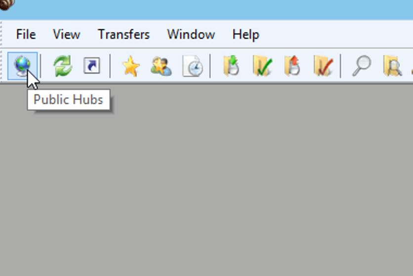 Чтобы файлы стали доступны необходимо создать подключение к сети p2p. Для этого нужен клик на пункте Public Hubs в меню пользователя и подключение к сети.