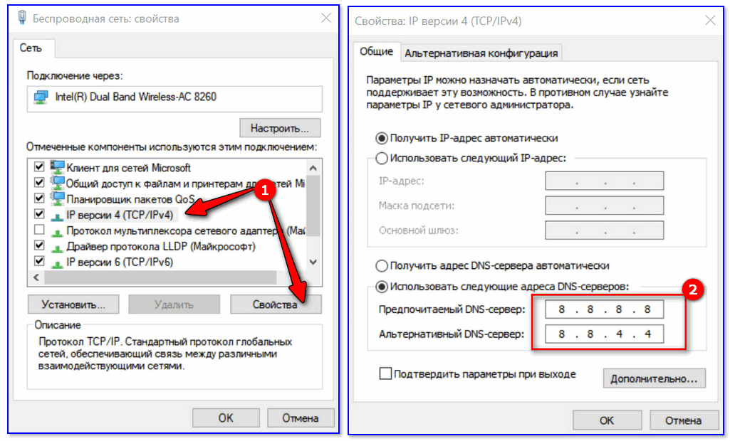 3) После нужно открыть свойства «IP версии 4» и вручную указать DNS-сервера: 8.8.8.8, 8.8.4.4 (это быстрые и надежные DNS от Google, но можно выбрать и другие).
