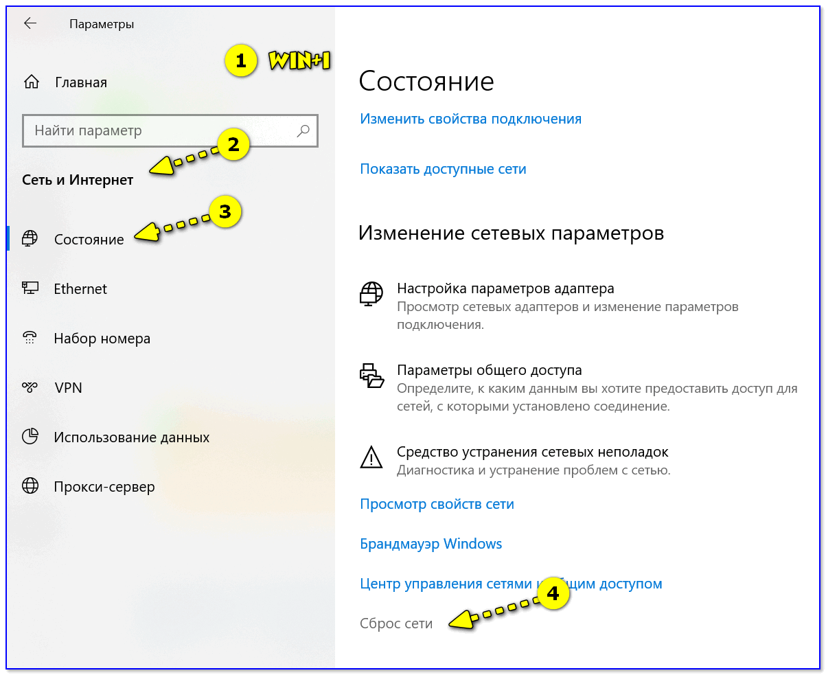 Попробуйте в ОС Windows 10 произвести сброс настроек сети. Для этого достаточно открыть параметры системы (сочетание Win+i), перейти в раздел «Сеть и интернет / Состояние» и прокрутить страничку вниз… там будет заветная ссылка.