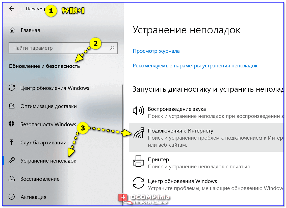 Кстати, диагностику можно запустить и др. путем: сначала открыть параметры ОС (Win+i), перейти в раздел «обновление и безопасность / устранение неполадок / подключение к Интернету».
