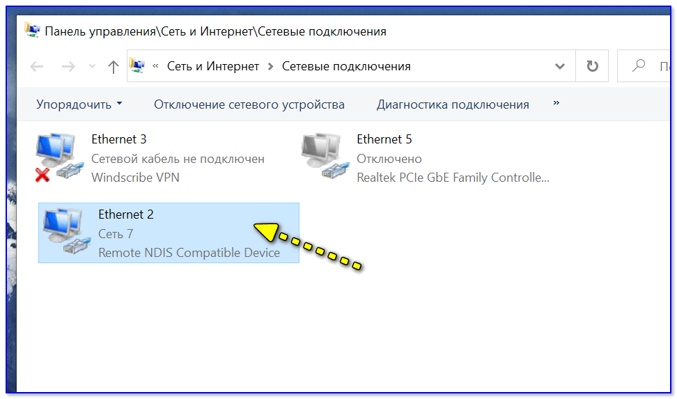 2) Далее откройте свойства (нажав ПКМ по нему) активного подключения (оно обычно цветное и без красных крестиков). Чтобы точно узнать его название — можете откл. телефон, и вновь его подключить.