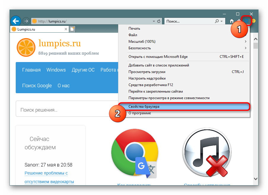 - Откройте IE, нажмите на кнопку в виде шестеренки и выберите пункт «Свойства браузера».