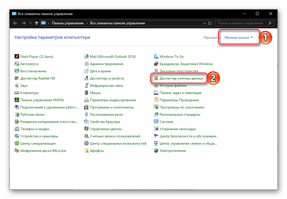 Дополнительно: Получить доступ к «Диспетчеру учетных данных» можно и не запуская Интернет Эксплорер. Достаточно лишь открыть «Панель управления», переключить режим ее отображения на «Мелкие значки» и найти там аналогичный раздел. Этот вариант особенно актуален для пользователей Windows 7, так как у них в окне «Свойства браузера» может отсутствовать кнопка «Управление паролями».