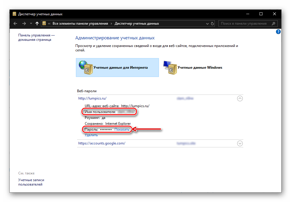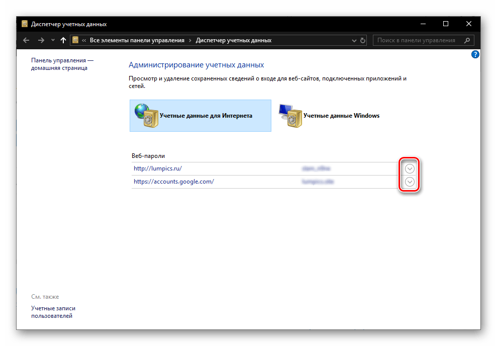 Вы попадете в раздел системы «Диспетчер учетных данных», именно в нем и находятся все логины и пароли, которые вы сохраняли в Эксплорере. Для их просмотра нажмите по указывающей вниз стрелке, расположенной напротив адреса сайта,