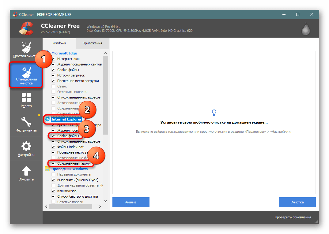 Если вы наблюдаете данную проблему систематически либо для всех сайтов, или, несмотря на сохраненный пароль, вас все равно выкидает с сайта, скорее всего, проблема кроется в другом. Вероятно, вы пользуетесь разными оптимизаторами системы, например, CCleaner, и не совсем правильно настраиваете его для удаления мусора. Находясь в разделе «Стандартная очистка» и на вкладке «Windows», обязательно проверьте, не стоят ли в блоке «Internet Explorer» галочки у пунктов «Сохраненные пароли» и «Cookie-файлы».