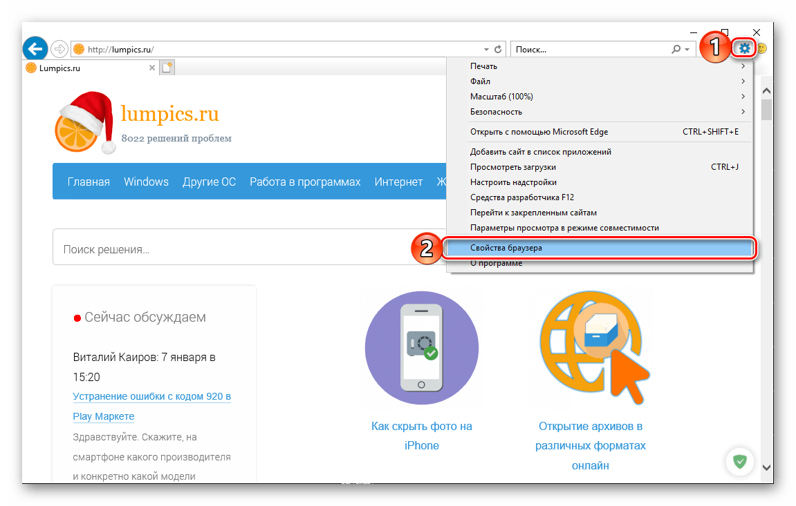 1. Откройте браузер Internet Exploler, затем в верхней правой части экрана щелкните по кнопке настроек и в выпадающем меню перейдите в «Свойства браузера».