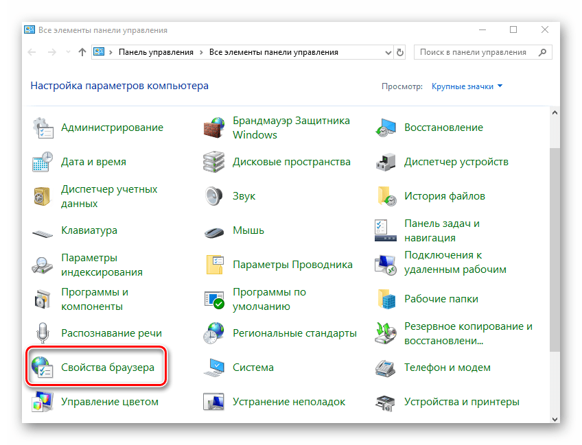 Откроется перечень доступных разделов. Кликните левой кнопкой мышки по тому из них, который называется «Свойства браузера».